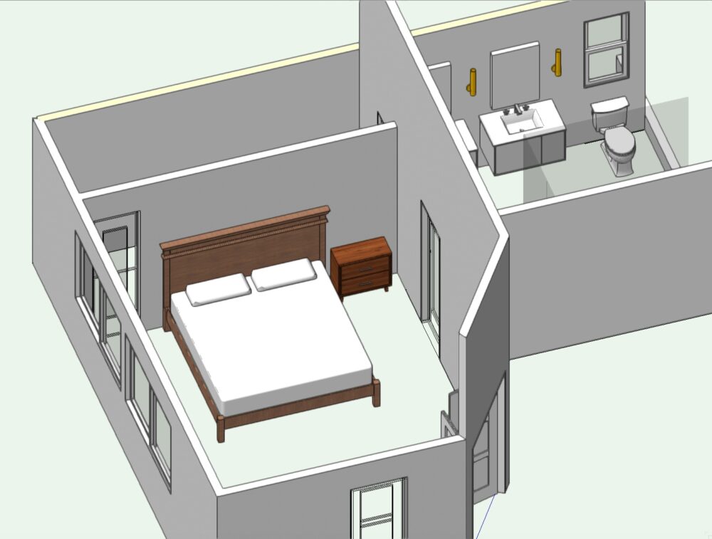 PROGRAM AND DESIGN: The client wanted a new kitchen. I suggested relocating the L shape kitchen floor plan and add a NANA wall system offering a wide, unobstructed view of the back yard. We also added an ADU adjacent to the garage for the client’s family visiting. On the SECOND FLOOR, we turn a very large master bedroom and added a walk-in closet adjacent to the master bath. The client had a photo inspiration for the master bath, I added many nice touches to make the bath fabulous. The family room adjacent to the kitchen will have a TV and seating area in front of a fireplace.